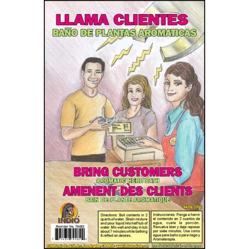 | Attract customers to your store by bathing in Indio Products Bring Customers Aromatic Bath Herbs weekly. Also can be used by salespeople. Directions: Boil contents in 2 quarts of water. Strain mixture and pour liquid into half tub of water. Mix well and stay in tub about 7 minutes while bathing and reflecting on desires. |